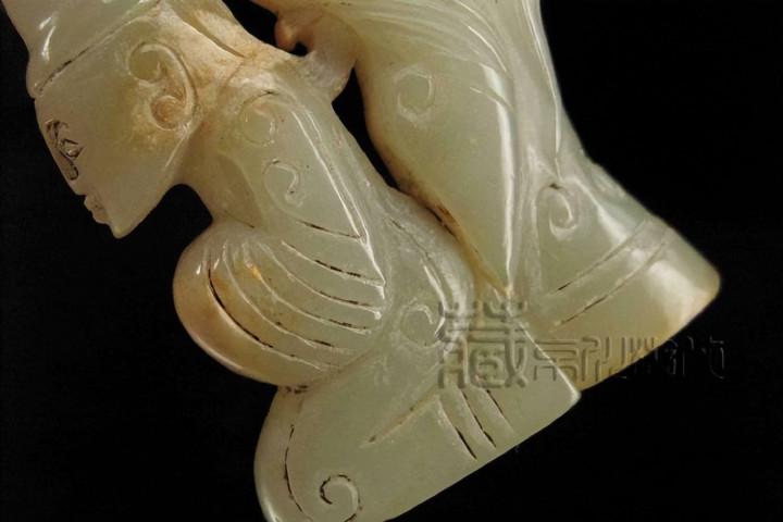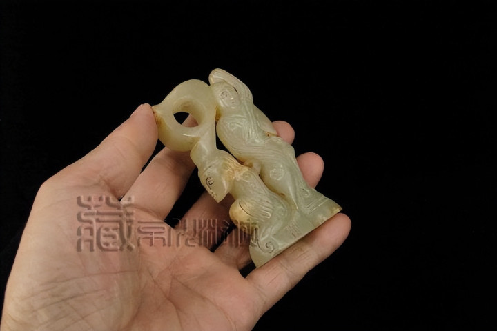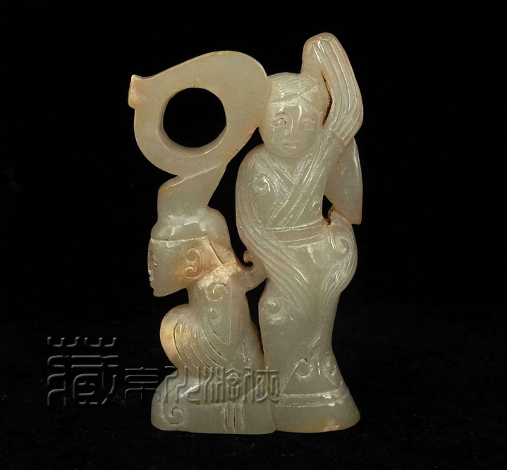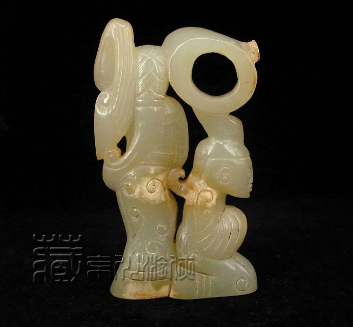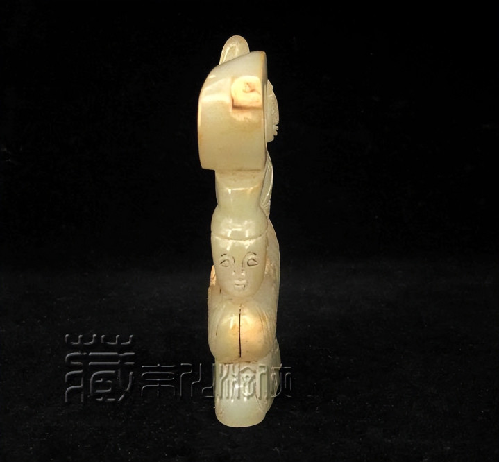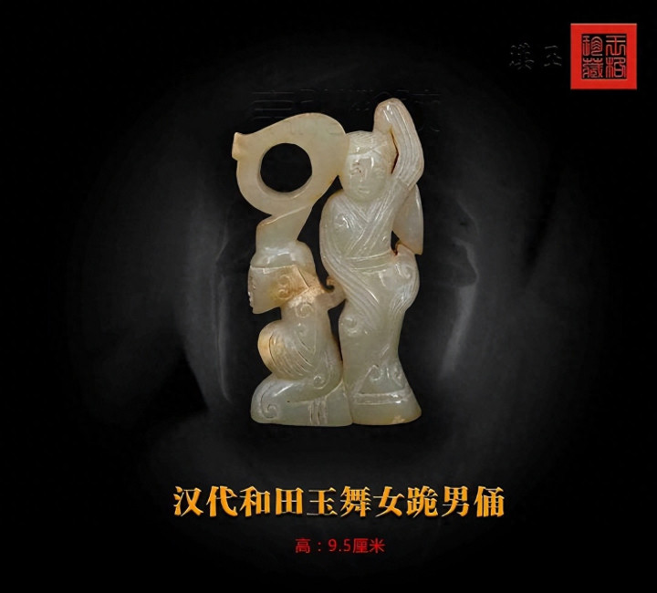 首赏其形。展目本品,器形完好,通高9.5厘米,手可把合手。可见其由三种不同的造型组合而成,其右为一个典型光显的舞女;左下则是一个呈跪姿的男性,左上为一似饱读瑟类的乐器。三种不不异子的组合,很难用一句话加以详细,然不错确定的说,这亦然一件礼器性质的玉器。