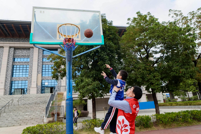维他奶(佛山)有限公司总司理王军和佛山市南海区狮山英才学校学生们沿途打篮球
